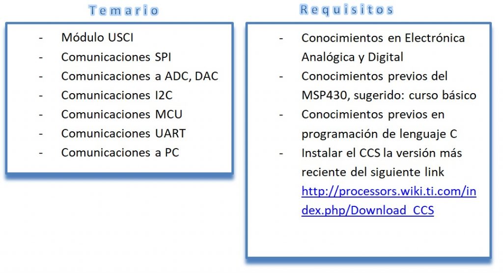 El curso avanzado de MCUs MSP430 está orientado a aprender a configurar y utilizar periféricos dirigidos a las comunicaciones en protocolos seriales, entre las comunicaciones que se cubren están: UART, SPI, I2C. En las prácticas se implementan comunicaciones entre microcontroladores así como entre microcontroladores y memorias, adcs, dacs, potenciómetros digitales, PC.